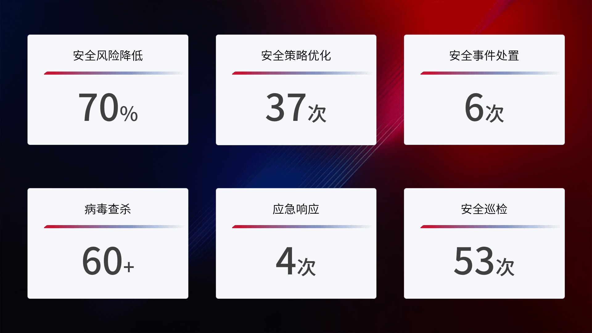 提供全面的安全事件报告体系,,,,包括处置报告、、、周报、、、、季度和年度总结,,结合持续监控,,,,帮助客户深入了解网络安全状况。。