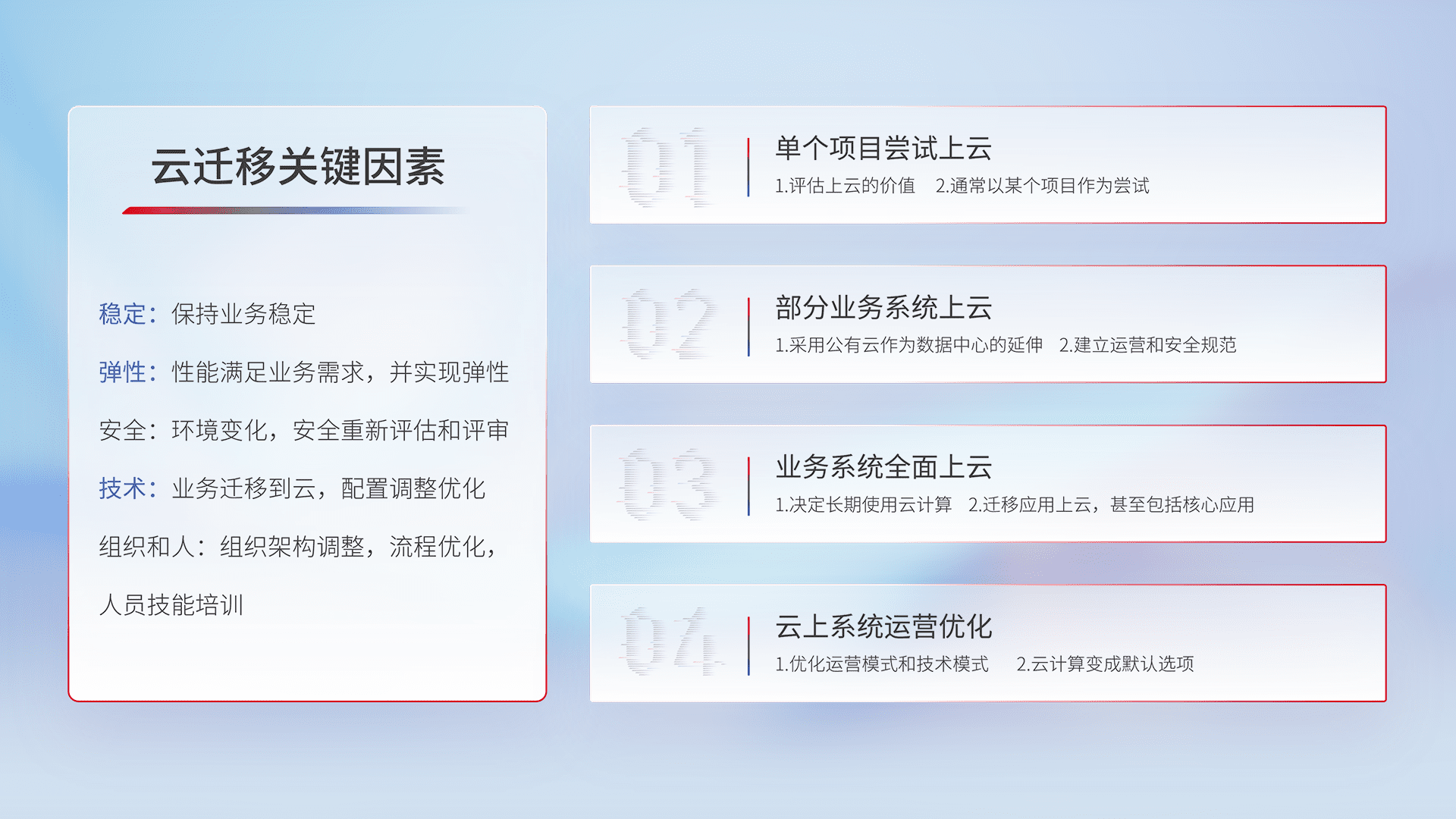 结合实际业务,,,,从规划设计、、云平台选型、、、、云原生改造、、、、数据迁移、、、集成交付,,,迁移全过程为客户识别最佳上云路径,,,做好风险识别管理,,,,设计网络架构、、身份权限、、、、安全审计合规、、、操作审计、、日志审计、、监控告警策略、、多站点容灾设计等,,对云上基础设施进行整体规划,,提升IT治理水平,,以满足弹性、、高可用、、高性能的需求。。